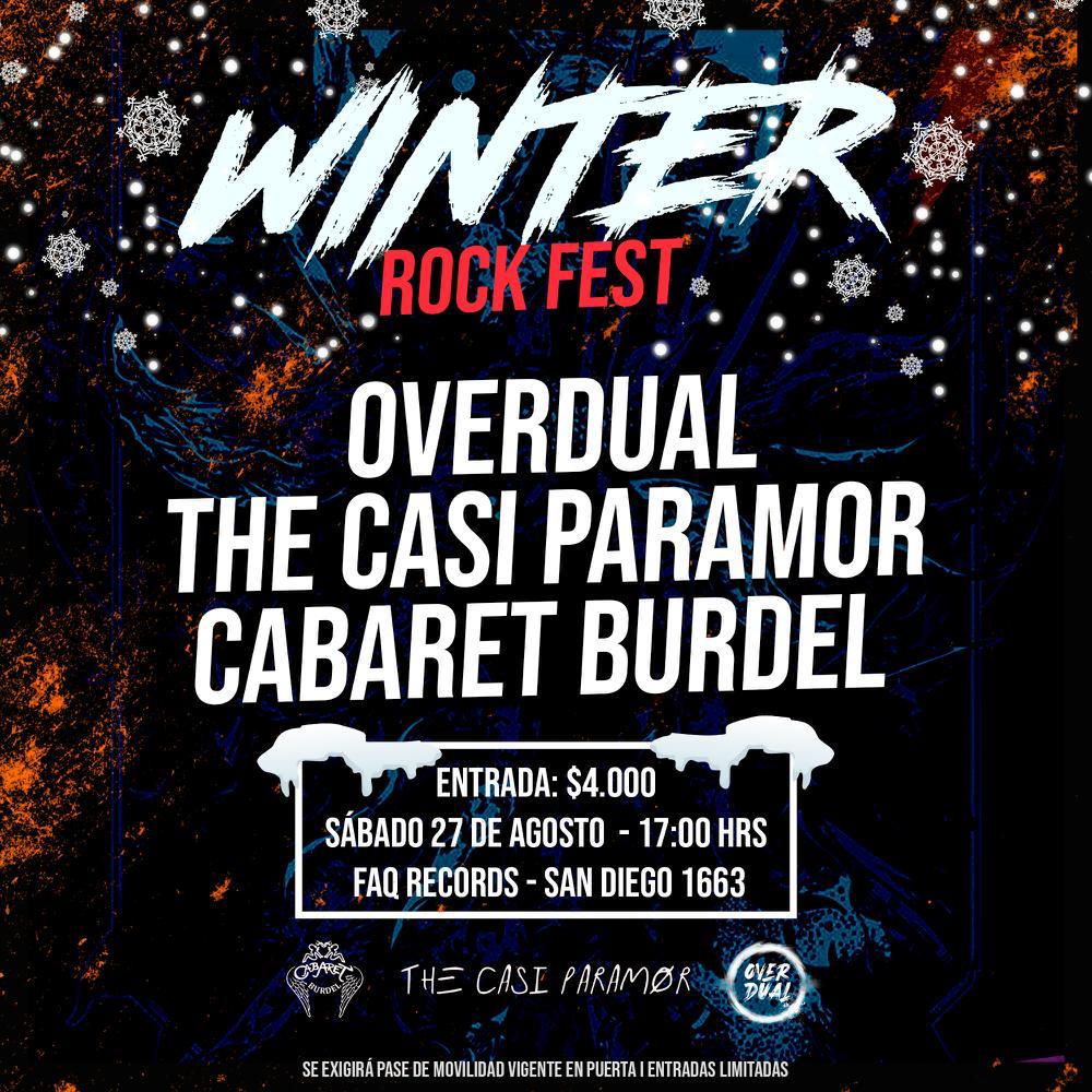 Con las presentaciones de las bandas Cabaret Burdel y OverDual, este sábado 27 de agosto se realizará la primera versión del Winter Rock Fest. El evento reúne a estas dos agrupaciones influenciadas por los sonidos alternativos, el metal, el pop y el punk, entre otras aristas musicales.