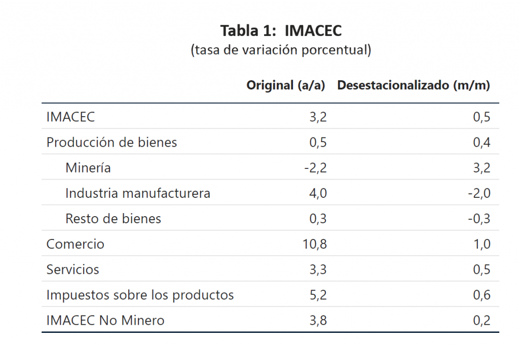 El resultado del Imacec se debe al crecimiento de los servicios y el comercio, lo que fue compensado en parte por una menor producción minera. En tanto, el aumento del Imacec en términos desestacionalizados fue determinado por la minería y los servicios.