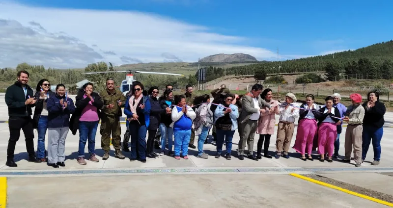 La Secretaria Regional Ministerial de Obras Públicas, Paloma Jara Valdés junto al Jefe de la XI Zona Aysén General Eduardo Palma Fuentes, la directora de Aeropuertos del MOP en la Región de Aysén Anita Álvarez Lemus y la presidenta de la Junta de Vecinos de Villa Ñirehuao Gloria Guzmán y directiva inauguraron el Punto de Posada de Helicópteros de Villa Ñirehuao, en la comuna de Coyhaique.