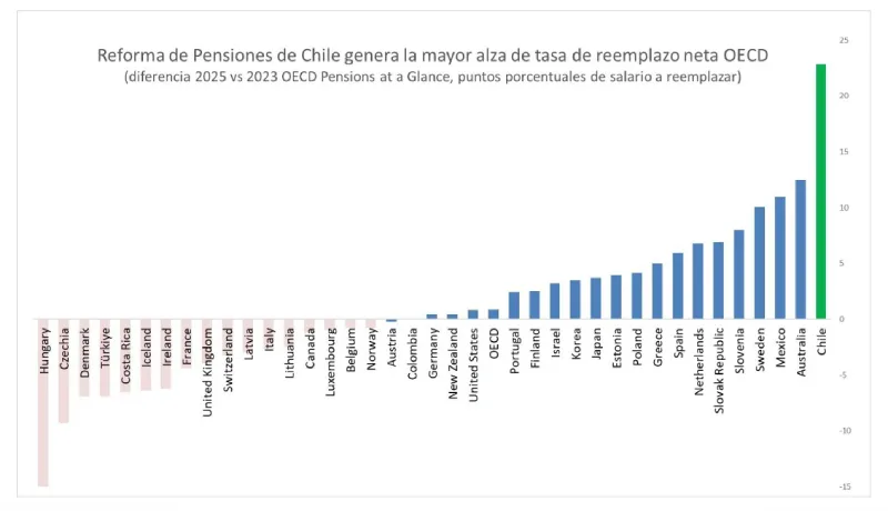 La OCDE proyecta que, tras la reforma, Chile alcanzará una tasa de reemplazo cercana al 61%, posicionándose muy próxima al estándar de la OCDE y consolidando uno de los progresos más importantes de la región.